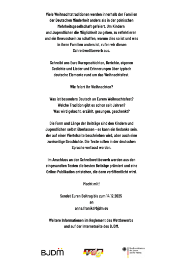 Um Kinder und Jugendliche dazu zu ermutigen, darüber nachzudenken, was „deutsche Weihnachten“ für sie bedeuten und welche typisch deutschen Elemente in ihren Familien vorkommen, veranstalten BJDM und VdG den Schreibwettbewerb „Mein deutsches Weihnachten“.