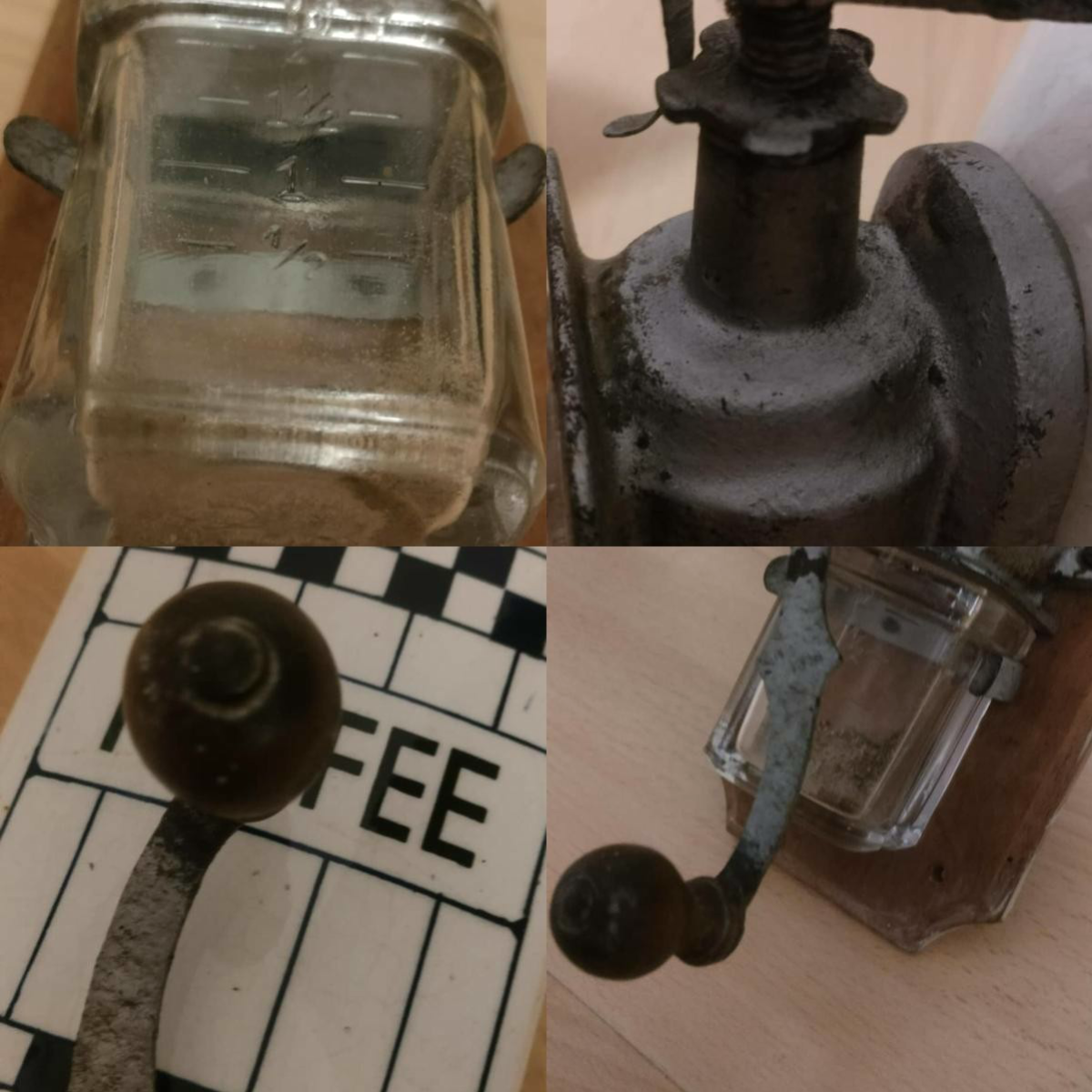 Es handelt sich um eine klassische Wandkaffeemühle deutscher oder schlesischer Produktion. Die Keramik (Fayence) ist relativ gut erhalten, während der gusseiserne Mechanismus und die Kurbel deutliche Spuren intensiver Nutzung aufweisen. Der Glasbehälter mit Skala war zu jener Zeit ein luxuriöses Detail – er erlaubte das präzise Abmessen der Bohnen. Es war kein Gerät für die Ärmsten, sondern eher Teil einer soliden bürgerlichen Küche.“