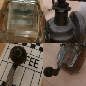 Jest to klasyczny młynek ścienny produkcji niemieckiej lub śląskiej. Ceramika (fajans) zachowała się nieźle, ale mechanizm żeliwny i korba noszą ślady intensywnego użytkowania. Szklany pojemnik z miarką to luksusowy dodatek w tamtych czasach – pozwalał precyzyjnie odmierzyć porcję ziarna. To nie był tani sprzęt dla biedoty, raczej wyposażenie solidnej kuchni klasy średniej.”
