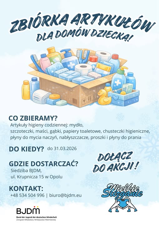 W ramach naszej akcji „Wielkie Ślizganie 2026 – Ślizgaj się śmiało, pomocy nigdy nie za mało!” organizujemy również zbiórkę artykułów higienicznych. Wszystkie zebrane produkty zostaną następnie przekazane domom dziecka w regionie. Szczególnie zaangażowane w tę akcję są Niemieckie Koła Przyjaźni (DFK), nasze lokalne grupy BJDM oraz lokalne szkoły. Ale zachęcamy wszystkich do wzięcia udziału w tę akcję zbiórkowej ![]()